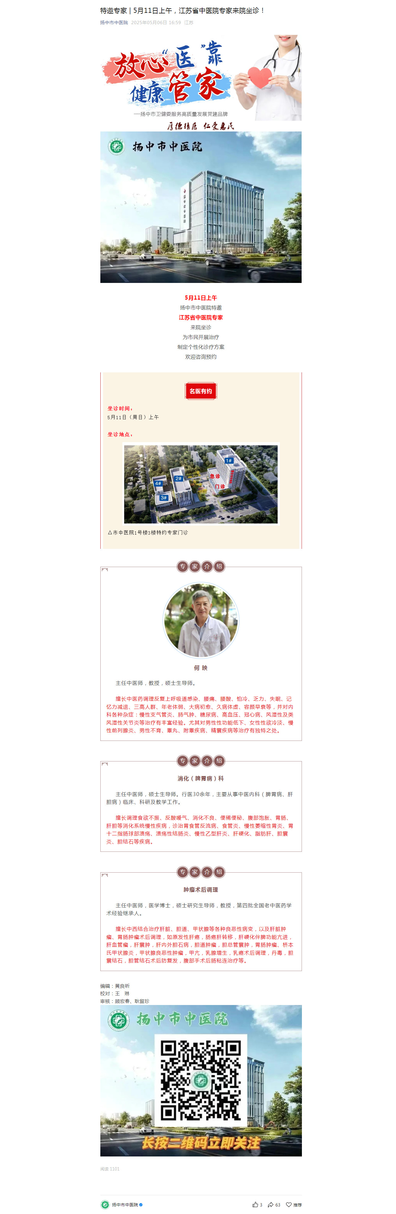 特邀专家 | 5月11日上午,江苏省中医院专家来院坐诊!
