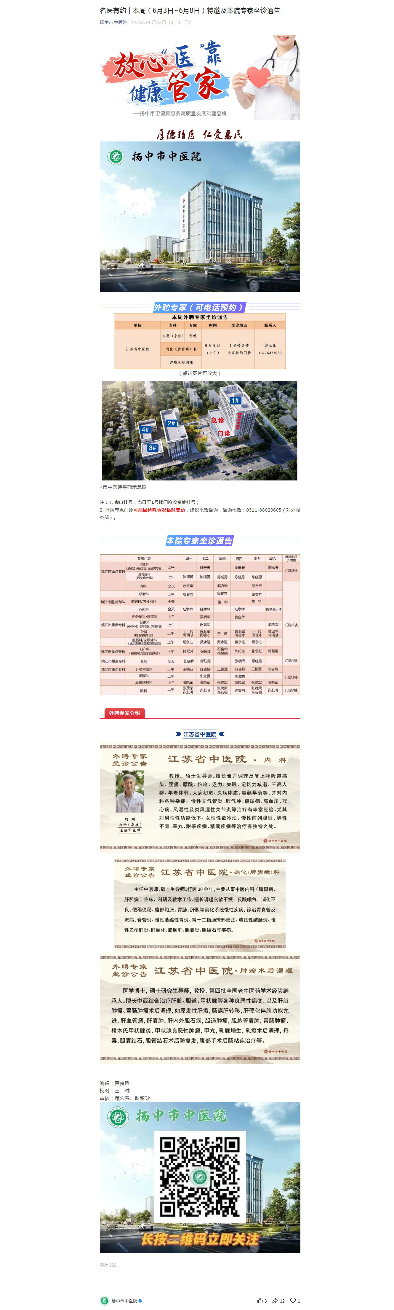 名医有约 | 本周(6月3日~6月8日)特邀及本院专家坐诊通告