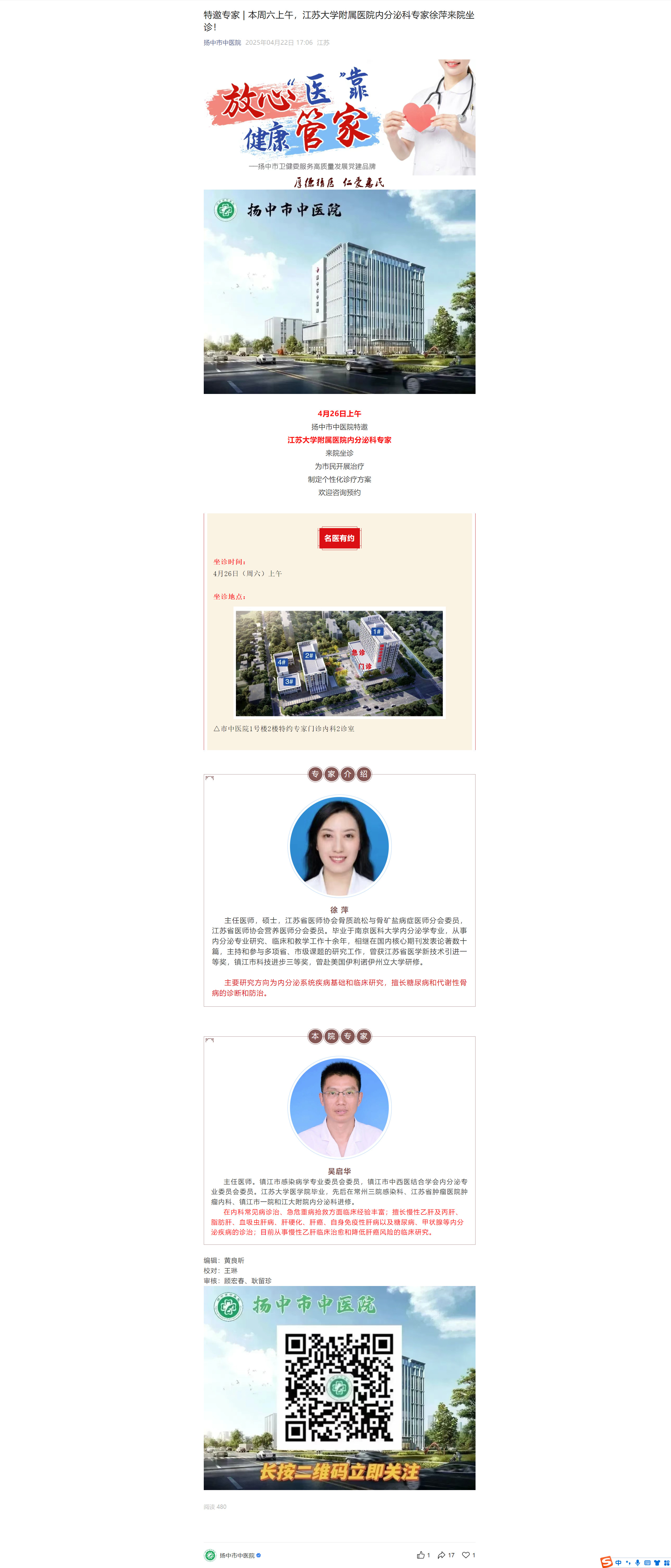 特邀专家 | 本周六上午,江苏大学附属医院内分泌科专家徐萍来院坐诊!