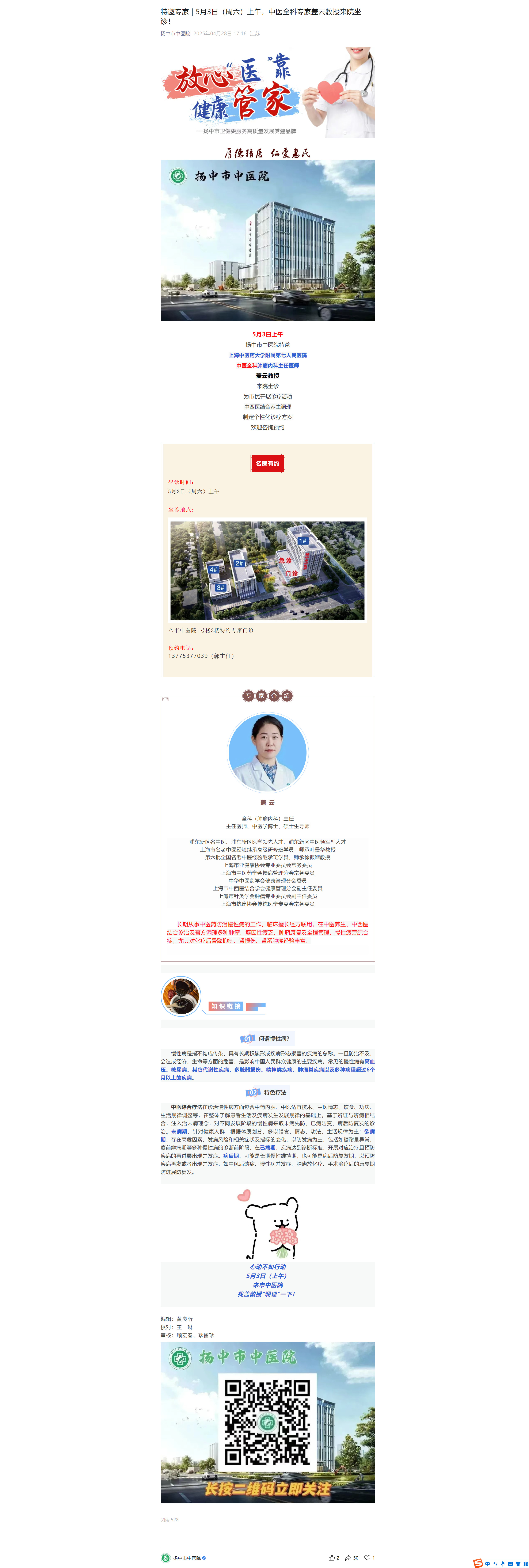特邀专家 | 5月3日(周六)上午,中医全科专家盖云教授来院坐诊!