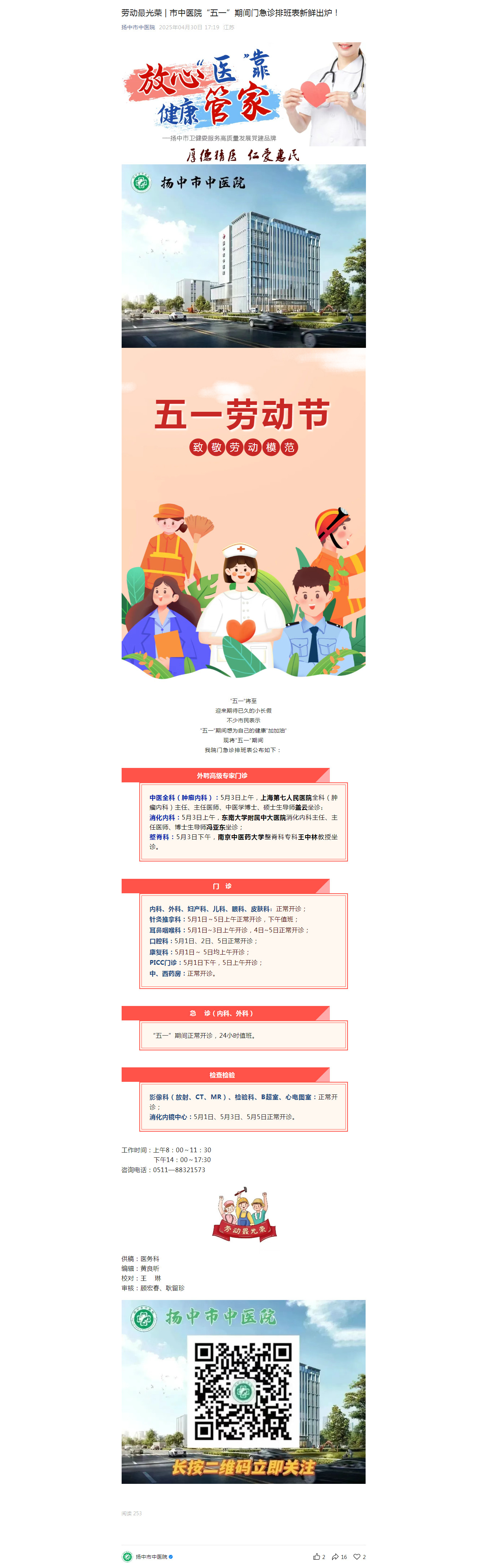 劳动最光荣 | 市中医院“五一”期间门急诊排班表新鲜出炉!
